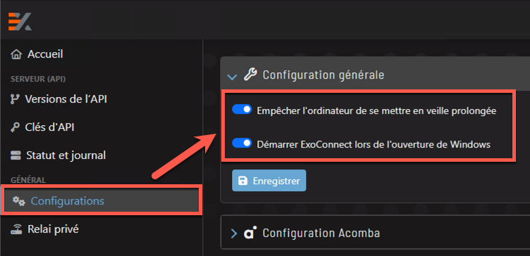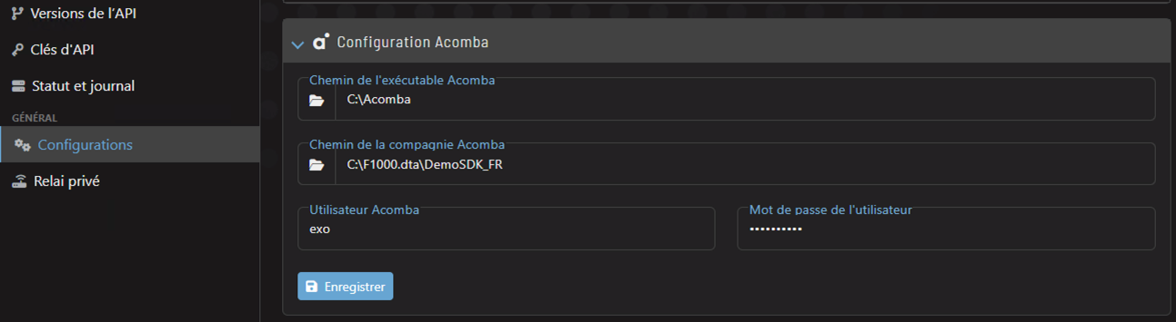 Cette section couvre l’ensemble des configurations d’ExoConnect pour Acomba, étape par étape, pour assurer un fonctionnement optimal de l’API locale. :